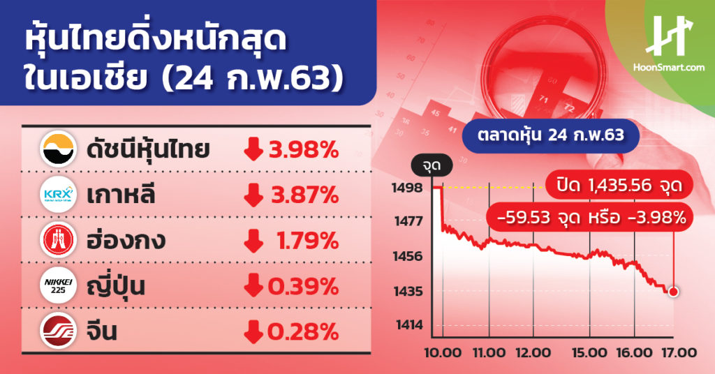 ตลาดหุ้นไทย เปิดตลาดวันจันทร์ที่ 24 ก.พ. ร่วงทันที 20 จุด จากแรงขายหุ้นทั่วกระดาน ฉุดหุ้นไทยร่วงแรงต่อเนื่องตลอดทั้งวัน ตามตลาดหุ้นทั่วโลก ที่ปรับตัวลง จากผลกระทบ โควิด-19 และปิดต่ำสุดของวันและต่ำสุดในรอบ 3 ปี 4 เดือน ที่ระดับ 1,435.56 จุด ลดลง 59.53 จุด หรือ 3.89 % มูลค่าซื้อขาย 76,431.30 ล้านบาท