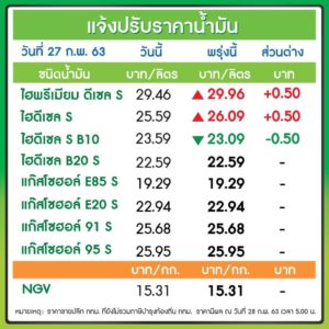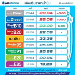 บริษัท ปตท.น้ำมันและการค้าปลีก (OR) ในกลุ่มบริษัท ปตท. (PTT) และบริษัท บางจาก คอร์ปอเรชั่น (BCP) ปรับลดราคาขายปลีกน้ำมันดีเซล B10 ลงลิตรละ 50 สตางค์ และปรับขึ้นน้ำมันดีเซล B7 ลิตรละ 50 สตางค์ โดยมีผลตั้งแต่เวลา 05.00 น. วันพรุ่งนี้ (28 ก.พ.2563) ตามการเปลี่ยนแปลงอัตราเงินกองทุนน้ำมันเชื้อเพลิง ตามมติของคณะกรรมการบริหารกองทุนน้ำมันเชื้อเพลิง (กบน.)