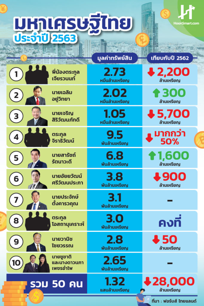 HoonSmart.com>>ฟอร์บส์ ไทยแลนด์ จัดอันดับ 50 มหาเศรษฐีไทย ประจำปี 2563 มีทรัพย์สินรวม 1.32 แสนล้านเหรียญ ลดลงถึง 2.8 หมื่นล้านเหรียญ เจอเศรษฐกิจตกต่ำ ดัชนีหุ้นหายไป 30% ทำให้ 38 คนรวยลดลง โดยเฉพาะ 6 คน หายไป 1,000 ล้านเหรียญ ขณะที่ 8 คนมั่งคั่งขึ้น “ตระกูลเจียรวนนท์”ยังคงร่ำรวยที่สุด 2.73 หมื่นล้านเหรียญ ลดลง 2.2 พันล้านเหรียญ อันดับ 2 “เฉลิม อยู่วิทยา” เจ้าของ Red Bull รวยขึ้นเป็น 2.02 หมื่นล้านเหรียญ เบียดกลุ่ม จิราธิวัฒน์ตกไปอยู่อันดับ 4 เหลือทรัพย์สิน 9,500 ล้านเหรียญ ทรุดฮวบกว่าครึ่ง อันดับ 3 “เจริญ สิริวัฒนภักดี” ทรัพย์สิน 1.05 หมื่นล้านเหรียญ ลดลง 5,700 ล้านเหรียญ
