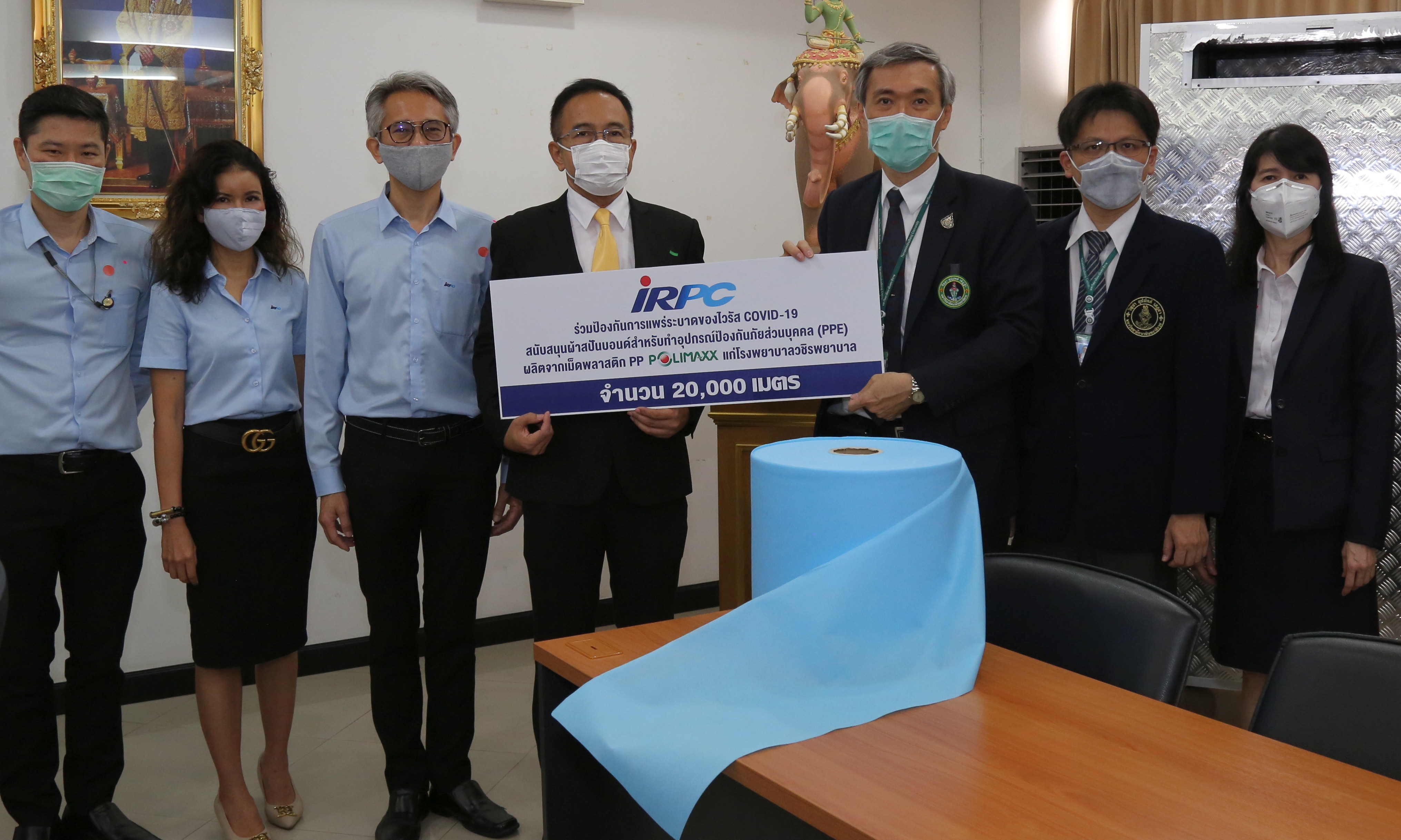IRPC เล็งเห็นถึงความสำคัญในการทุ่มเทเสียสละของบุคลากรทางการแพทย์ ตลอดจน ทุกหน่วยงานเกี่ยวข้องในการปฎิบัติหน้าที่เพื่อส่วนรวม จึงร่วมมือกับลูกค้าของบริษัทฯ ที่ซึ่งเป็นโรงงานผลิตผ้าสปันบอนด์ ผลิตจากเม็ดพลาสติก PP เกรดพิเศษ มอบให้กับมหาวิทยาลัยนวมินทราธิราช โดยคณะแพทยศาสตร์วชิรพยาบาล นำไปผลิตเป็นชุด PPE ใช้ในโรงพยาบาลวชิรพยาบาลและส่งมอบให้กับโรงพยาบาลเครือข่าย