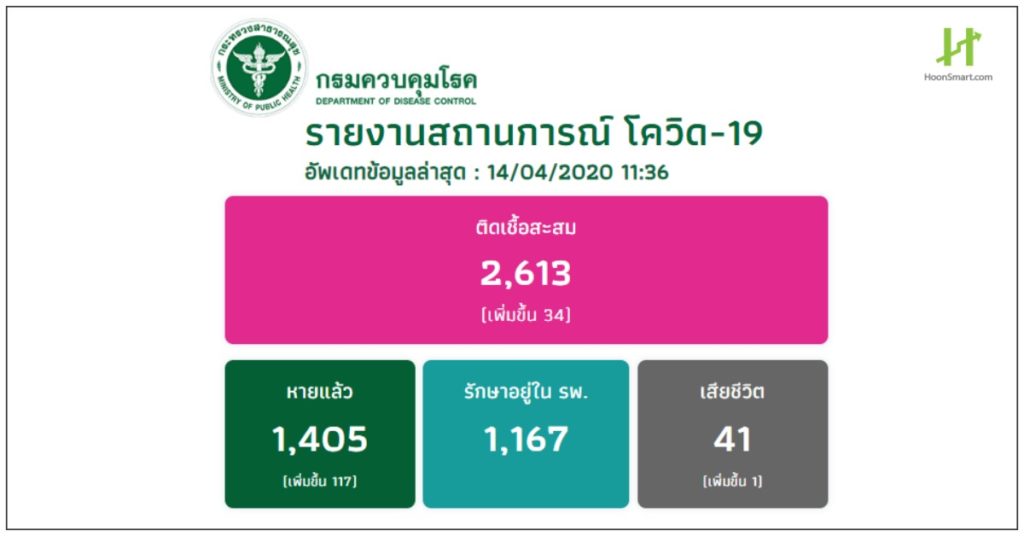 นพ.ทวีศิลป์ วิษณุโยธิน โฆษกศูนย์บริหารสถานการณ์การแพร่ระบาดของโรคติดเชื้อไวรัสโคโรนา 2019 (COVID-19 ) หรือ ศบค. แถลงสถานการณ์ประจำวันที่ 14 เม.ย.2563 มีผู้ติดเชื้อรายใหม่เพิ่มขึ้น 34 ราย รวมยอดผู้ป่วยสะสม 2,613 ราย เสียชีวิตเพิ่ม 1 ราย รวมสะสม 41 ราย ผู้ป่วยกลับบ้านได้รวม 1,405 ราย