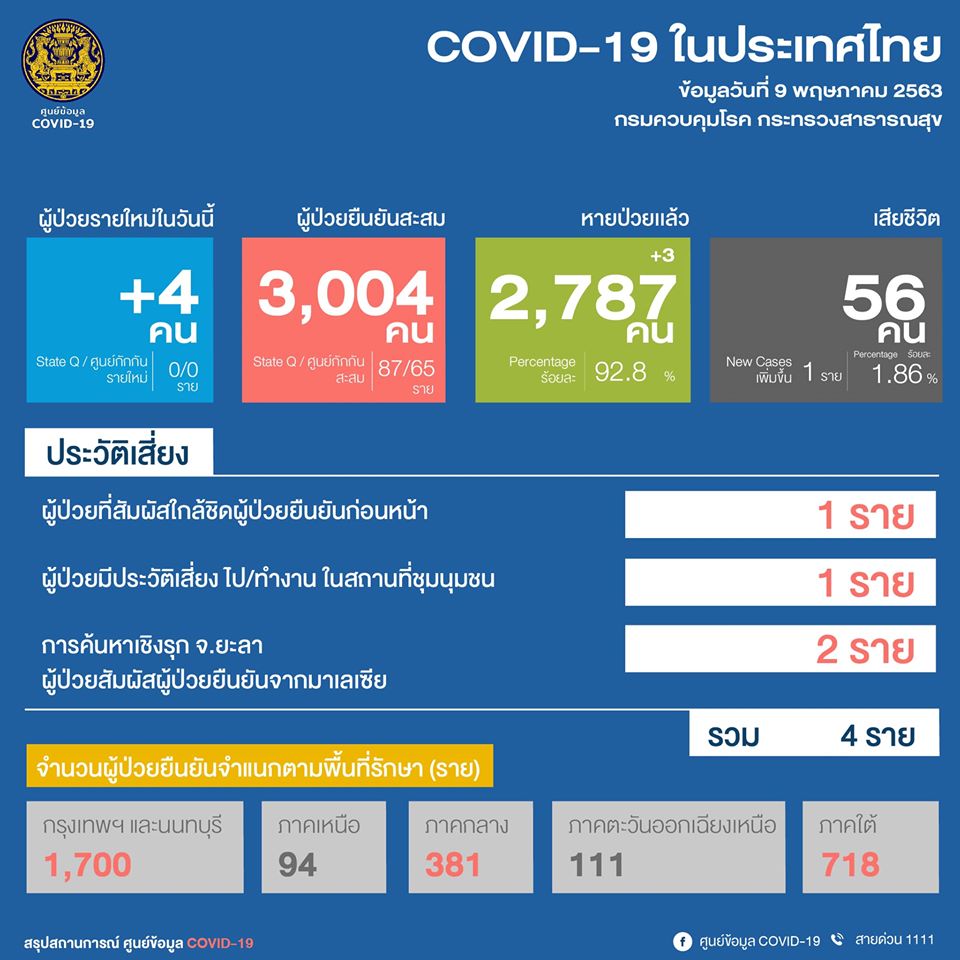 นพ.ทวีศิลป์ วิษณุโยธิน โฆษกศูนย์บริหารสถานการณ์การแพร่ระบาดของโรคติดเชื้อไวรัสโคโรนา 2019 (COVID-19 ) หรือ ศบค. แถลงสถานการณ์ประจำวันที่ 9 พ.ค.2563 มีผู้ติดเชื้อรายใหม่เพิ่ม 4 ราย ยอดรวมสะสม 3,004 ราย รักษาหายเพิ่ม 3 ราย รวมเป็น 2,787 ราย และมีผู้เสียชีวิตเพิ่ม 1 ราย ยอดสะสม 56 ราย