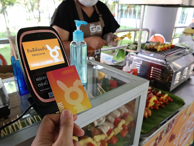 รัชนี แสนศิลป์ชัย กรรมการผู้จัดการ บริษัท บางกอก สมาร์ทการ์ด ซิสเทม (บีเอสเอส) ผู้ให้บริการบัตรแรบบิท (Rabbit Card) ร่วมกับ ศ.ดร.สุชัชวีร์ สุวรรณสวัสดิ์ อธิการบดี สถาบันเทคโนโลยีพระจอมเกล้าเจ้าคุณทหารลาดกระบัง(สจล.) เปิดตัวนวัตกรรมรถเข็นขายอาหาร รองรับการชำระเงินด้วยบัตรแรบบิท เพื่อหลีกเลี่ยงการสัมผัสเชื้อโรคที่อาจปนเปื้อนมากับธนบัตรและเหรียญ เพิ่มความมั่นใจให้ผู้บริโภคในยุค New Normal ณ งาน KMITL Street Food Academy 2020