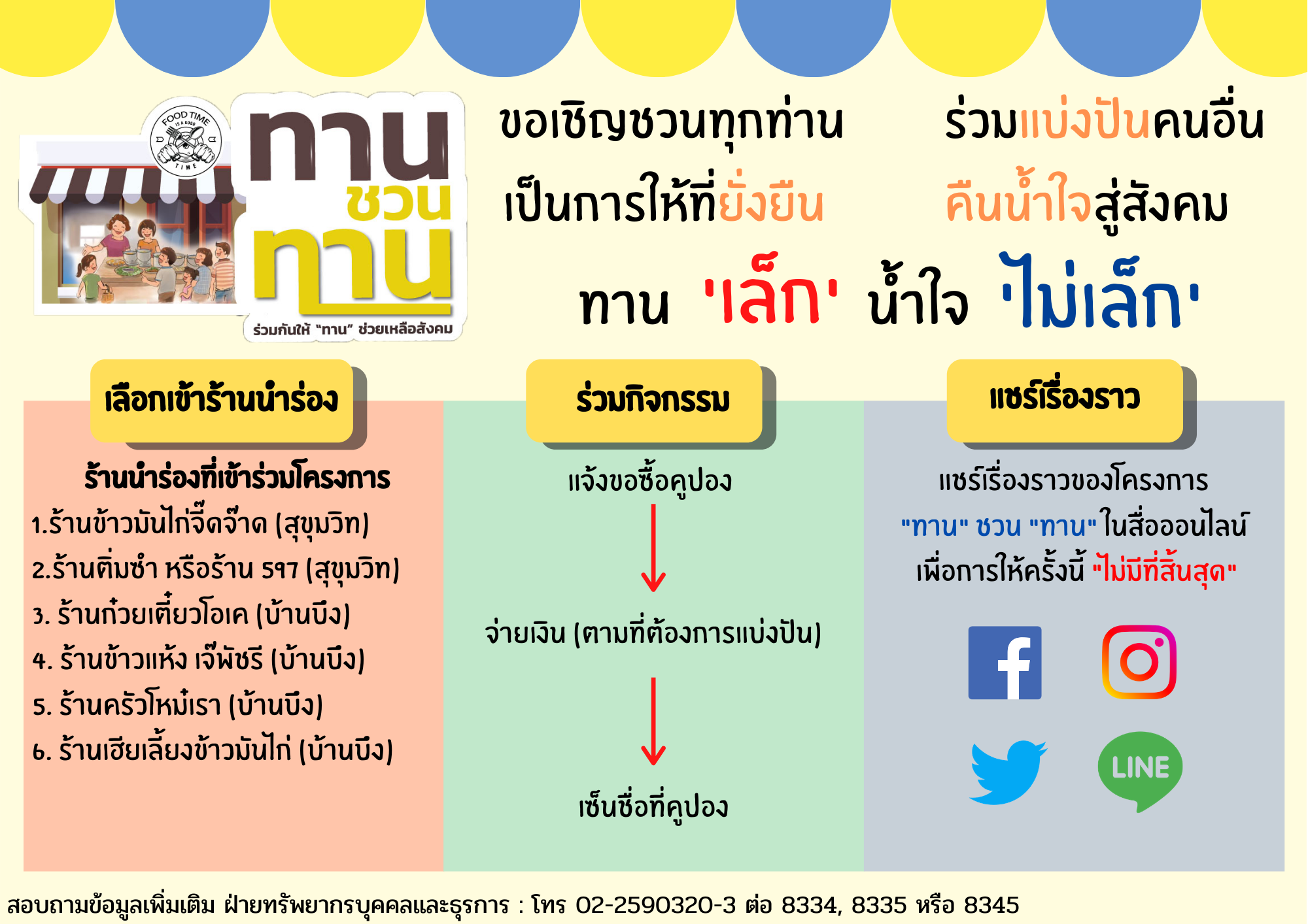 สำหรับผู้สนใจรับสติ๊กเกอร์โครงการ “ทานชวนทาน” สามารถติดต่อขอรับได้ที่คุณจิราภรณ์หรือคุณกวีวรรณ โทร. 02-259-0320-3 ต่อ 8334 หรือ 8338