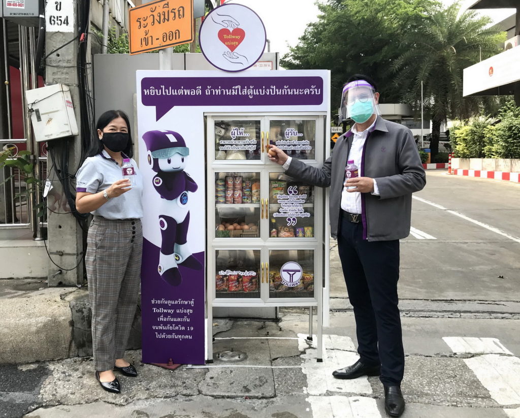 นายธานินทร์ พานิชชีวะ กรรมการผู้จัดการ พร้อมด้วย น.ส.อัจฉรา เจริญพร ผอ.ฝ่ายทรัพยากรมนุษย์และสื่อสารองค์กร บริษัท ทางยกระดับดอนเมือง ติดตั้ง “ตู้โทลล์เวย์แบ่งสุข” เปิดโอกาสให้คนใจดีนำสิ่งของต่างๆ มาใส่ในตู้ เพื่อแบ่งปันน้ำใจ ช่วยเหลือผู้ที่ขาดแคลนและประชาชนที่ได้รับผลกระทบจากการระบาดของไวรัสโควิด-19 หยิบไปได้ โดยตู้โทลล์เวย์แบ่งสุขจะตั้งให้บริการทุกวันระหว่างเวลา 05.00 -20.00 น. ณ บริเวณด้านหน้าสำนักงานใหญ่บมจ.ทางยกระดับดอนเมือง ถ.วิภาวดีรังสิต เขตดอนเมือง