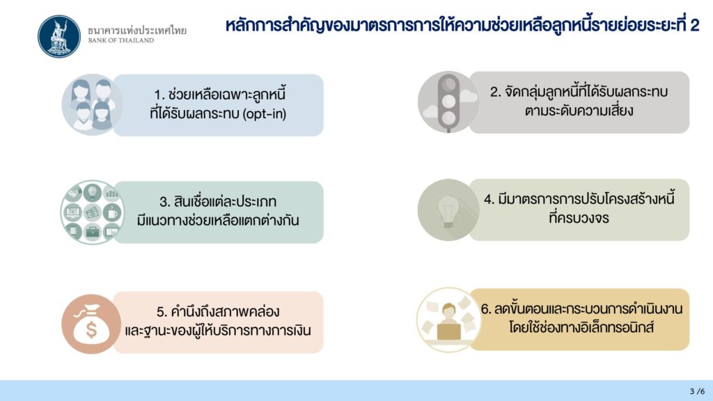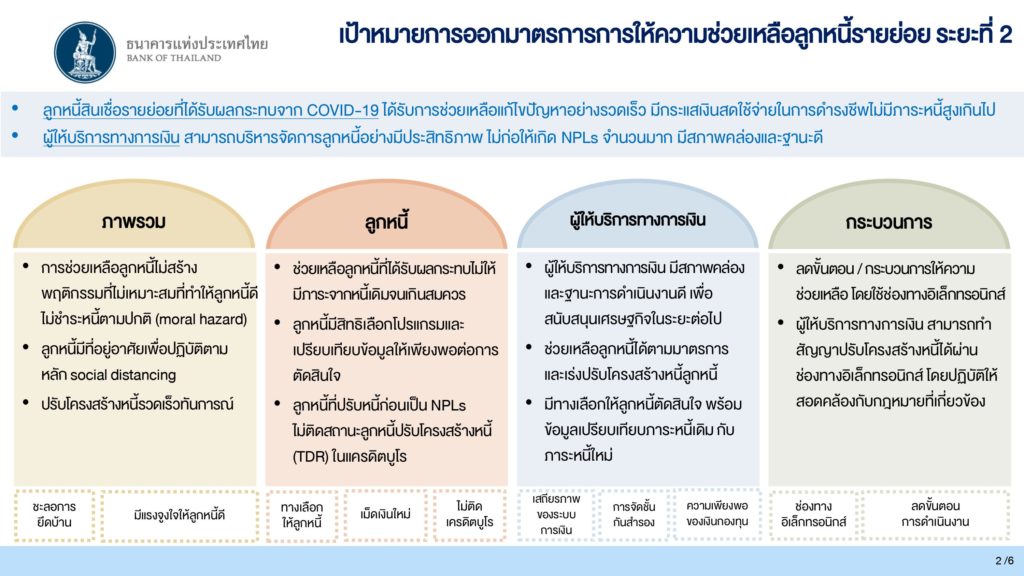 อย่างไรก็ดี สถานการณ์การระบาดของ COVID-19 ยังคงมีความไม่แน่นอนสูง และส่งผลกระทบทางเศรษฐกิจในวงกว้าง ประกอบกับมาตรการที่ออกไปก่อนหน้านี้ จะทยอยสิ้นสุดลงในเดือนนี้ ธปท. จึงได้หารือกับสถาบันการเงิน สถาบันการเงินเฉพาะกิจ สมาคมและชมรมของผู้ให้บริการทางการเงินรวม 9 แห่ง ได้ข้อสรุปร่วมกันว่ามีความจำเป็นต้องออกมาตรการเพิ่มเติมระยะที่ 2 เพื่อช่วยเหลือลูกหนี้ให้มีสภาพคล่องสำหรับใช้จ่ายในสิ่งที่จำเป็นต่อการดำรงชีวิตและสามารถประกอบอาชีพต่อไปได้
