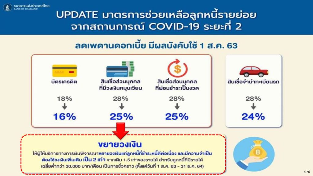 (3) มาตรการพื้นฐานขั้นต่ำเพื่อช่วยเหลือลูกหนี้รายย่อยระยะที่ 2 ซึ่งได้ปรับปรุงจากความเห็นและข้อเสนอที่ได้รับฟังจากประชาชนกลุ่มต่างๆ โดยครั้งนี้จะยึดเอาความต้องการของประชาชนเป็นที่ตั้ง รวมทั้งขยายขอบเขตให้ครอบคลุมประชาชนทุกกลุ่ม เพราะคงไม่มีประชาชนกลุ่มใดที่ไม่ได้รับผลกระทบ ไม่มีการจำกัดวงเงินสินเชื่อสำหรับผู้ที่มีสิทธิ์โดยผู้ให้บริการทางการเงินจะต้องจัดให้มีทางเลือกเพื่อให้ลูกหนี้สามารถเลือกได้ ตามประเภทสินเชื่อ ดังนี้