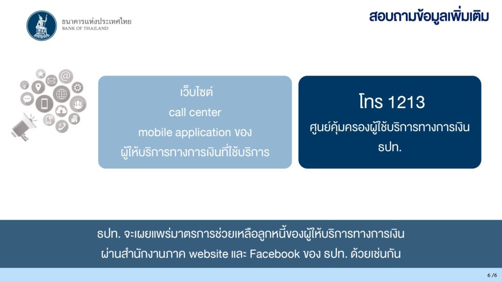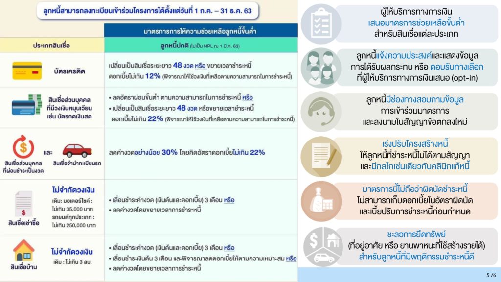 ทั้งนี้ลูกหนี้ที่ต้องการความช่วยเหลือสามารถแจ้งความประสงค์ได้ตั้งแต่วันที่ 1 กรกฎาคม-31 ธันวาคม 2563 ผ่านช่องทางที่ผู้ให้บริการทางการเงินเปิดให้บริการ เช่น แอปพลิเคชันเว็บไซต์ Call Center หรือการส่งข้อความ SMS