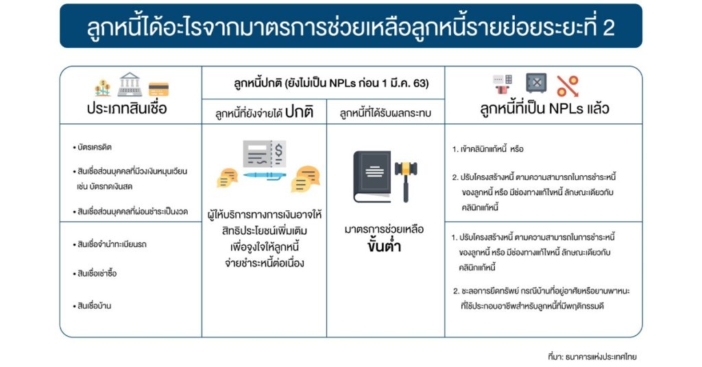ทั้งนี้ มาตรการช่วยเหลือลูกหนี้เพิ่มเติมระยะที่ 2 มีสาระสำคัญสรุปได้ดังนี้