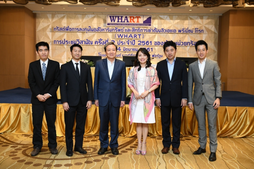 จรีพร จารุกรสกุล (กลางขวา) ประธานกรรมการบริษัท และประธานเจ้าหน้าที่บริษัทกลุ่ม บริษัท ดับบลิวเอชเอ คอร์ปอเรชั่น (WHA) ในฐานะผู้สนับสนุนและผู้บริหารอสังหาริมทรัพย์ กำธร ตติยกวี ประธานกรรมการ (กลางซ้าย) และปิยะพงศ์ พินธุประภา กรรมการและประธานเจ้าหน้าที่บริหาร (ที่ 2 จากซ้าย) พร้อมคณะกรรมการ บริษัท ดับบลิวเอชเอ เรียล เอสเตท แมเนจเม้นท์ (WHAREM) ผู้จัดการกองทรัสต์ WHART จัดการประชุมสามัญประจำปี 2561 ครั้งที่ 2 โดยผู้ถือหุ้นอนุมัติการลงทุนในอสังหาริมทรัพย์ สิทธิการเช่า และสิทธิการเช่าช่วงอสังหาริมทรัพย์ และทรัพย์สินอื่นที่เกี่ยวข้องของทรัพย์สินที่จะลงทุนเพิ่มเติม 4 โครงการ พร้อมทั้งการเพิ่มทุนของ WHART ครั้งที่ 3ไม่เกิน 299.18 ล้านหน่วย เพื่อใช้ในการลงทุนในอสังหาริมทรัพย์ สิทธิการเช่า และสิทธิการเช่าช่วงของอสังหาริมทรัพย์ และทรัพย์สินอื่นที่เกี่ยวข้องเพิ่มเติม และอนุมัติเสนอขายหน่วยทรัสต์บางส่วนเป็นการเฉพาะเจาะจงให้แก่ WHA หรือกลุ่มบุคคลเดียวกันของ WHA รวมทั้งอนุมัติกู้ยืมเงินวงเงินกู้ประมาณไม่เกิน 1,780 ล้านบาท