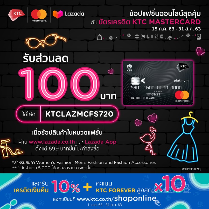 “เคทีซี” หรือ บริษัท บัตรกรุงไทย จัดสิทธิพิเศษสำหรับสมาชิกบัตรเครดิตเคทีซี-มาสเตอร์การ์ดทุกประเภท รับส่วนลดทันที 100 บาท เมื่อช้อปออนไลน์ในหมวดแฟชั่นสตรีและบุรุษ รวมถึงเครื่องประดับแฟชั่นต่างๆ ตั้งแต่ 699 บาท ผ่าน www.lazada.co.th และแอปพลิเคชัน “LAZADA” โดยระบุรหัสส่วนลด “KTCLAZMCFS720” (จำกัดสูงสุด 5,000 โค้ด) ตั้งแต่วันนี้ – 31 ส.ค. 2563 พิเศษ แลกรับเครดิตเงินคืน 10% ใช้คะแนน KTC FOREVER เท่ายอดซื้อต่อรายการ และรับคะแนน KTC FOREVER สูงสุด 10 เท่าถึง 31 ส.ค. 2563 โดยลงทะเบียนแลกรับสิทธิ หรือดูรายละเอียดเพิ่มเติมได้ที่ www.ktc.co.th/shoponline