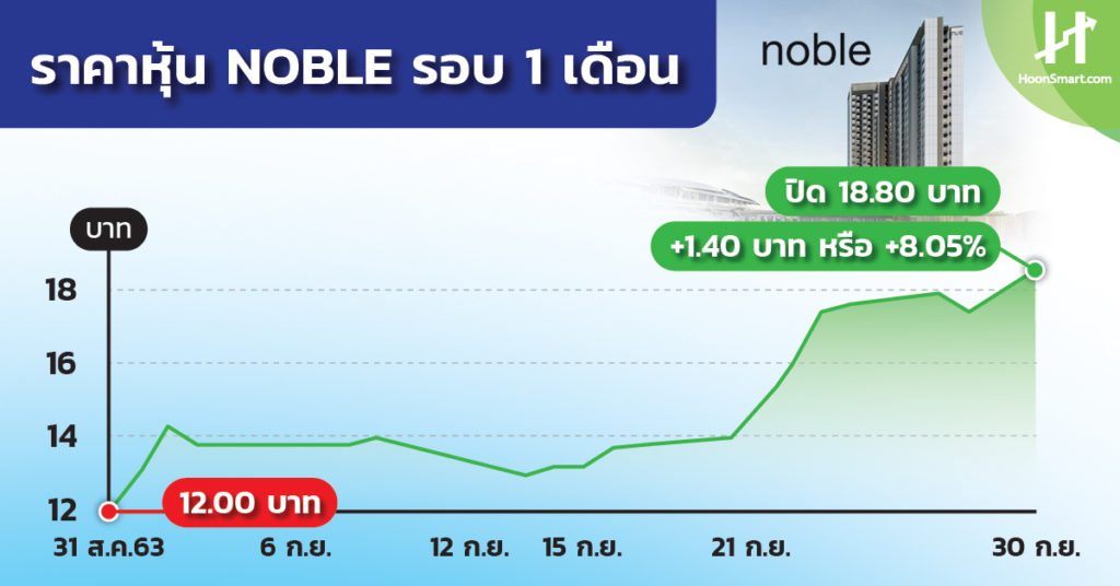 หุ้นบริษัท โนเบิล ดีเวลลอปเมนท์ (NOBLE) พุ่งแรง ราคาดีดขึ้นไปถึง 19.20 บาท ก่อนปิดที่ 18.80 บาท เพิ่มขึ้น 1.40 บาทหรือ 8.05% ด้วยมูลค่าการซื้อขายกว่า 491 ล้านบาท สวนทางดัชนีโดยรวมที่ทรุด 20.30 จุด หรือ 1.61% เมื่อวันที่ 30 ก.ย.2563 สร้างกำไรให้กับผู้ถือหุ้นทุกราย โดยเฉพาะเจ้าของ และนักลงทุนรายใหญ่ที่เพิ่งซื้อบิ๊กล็อตไปคนละ 10 ล้านหุ้น ในราคาหุ้นละ 11.60 บาท เมื่อวันที่ 1 ก.ย.ที่ผ่านมา กลุ่มนาย สมพงษ์ ชลคดีดำรงกุล หรือเสี่ยปู่ซื้อหุ้นจากนายธงชัย บุศราพันธ์ และนายนเรศ งามอภิชน ซื้อจากนิติบุคคลของนาย แฟรงค์ ฟง คึ่น เหลียง ทำให้การลงทุนในรอบ 1 เดือน (1-30 ก.ย.) ได้กำไรถึงหุ้นละ 7.20 บาท คิดเป็นผลอัตราผลตอบแทนประมาณ 62% หรือเท่ากับได้กำไรคนละตั้ง 72 ล้านบาท สำหรับการใช้เงินลงทุนจำนวน 116 ล้านบาท