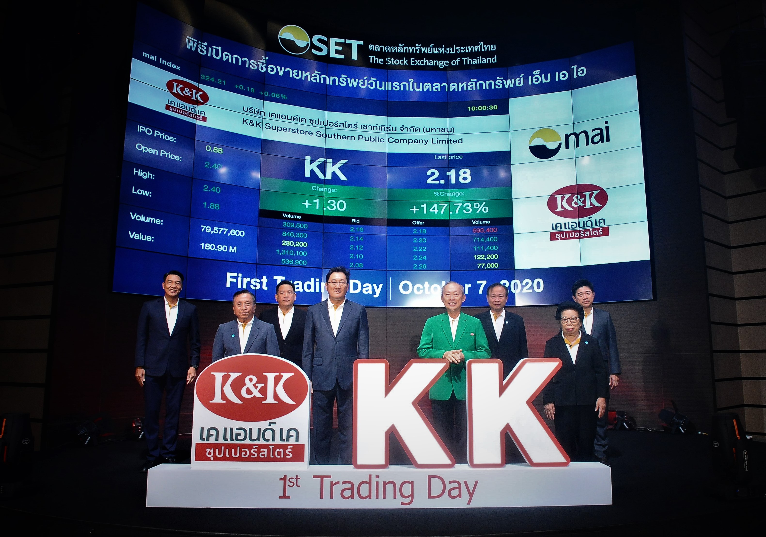 นายกวิศพงษ์ สิริธนนนท์สกุล กรรมการผู้จัดการ บริษัท เคแอนด์เค ซุปเปอร์สโตร์ เซาท์เทิร์น (KK) เปิดเผยว่า หถุ้น KK ซื้อขายวันแรก (7 ต.ค.) ในตลาดหลักทรัพย์ เอ็ม เอ ไอ (mai) ราคาเปิด 2.40 บาท เหนือจอง 1.52 บาท หรือ 172.73 % สะท้อนความเชื่อมั่นของนักลงทุนที่มีต่อบริษัทฯ ขณะเดียวกัน สภาพตลาดหุ้นโดยรวมเป็นบวก ถือเป็นหุ้น IPO อีกหนึ่งบริษัท ที่ประสบความสำเร็จและสร้างความประทับใจให้กับผู้ลงทุนได้