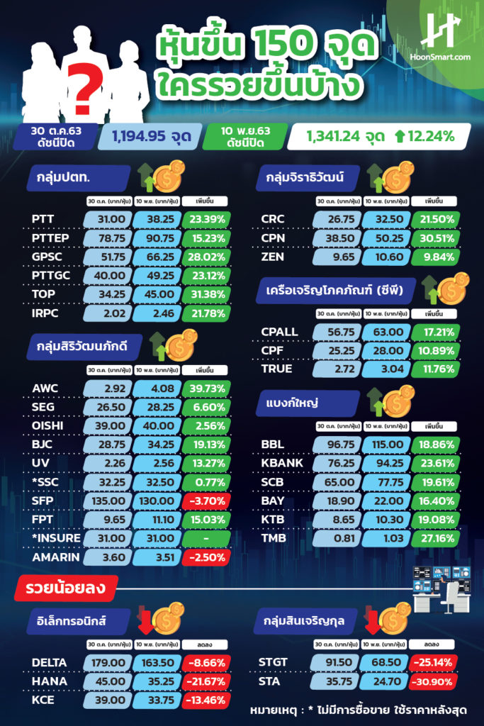 HoonSmart.com>>หุ้นไทยที่พุ่งแรง 55 จุด หรือ 4.31% ปิดที่ระดับ 1,341.24 จุด ถือว่าดีดกลับขึ้นมาแรงและเร็วเกินคาด เพียง 7 วัน กระโดดขึ้นมา 146.29 จุด คิดเป็น 12.24% เทียบกับระดับปิดต่ำสุดของปีที่ 1,194.95 จุด เมื่อวันที่ 30 ต.ค.ที่ผ่านมา ส่งผลให้ราคาหุ้นหลายตัววิ่งขึ้นมา 20-30% เกิดคำถามว่า จะลุยต่อได้หรือไม่ และหุ้นตัวไหน กลุ่มไหนจะไปต่อ