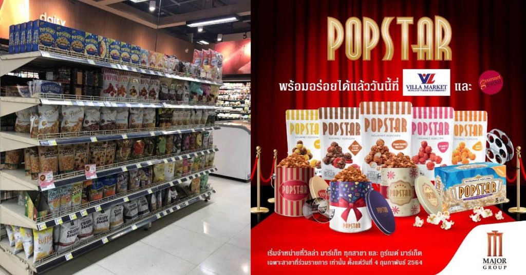 ดังนั้น เพื่อตอบรับกระแสป๊อปคอร์นฟีเวอร์ เมเจอร์ ซีนีเพล็กซ์ กรุ้ป ได้ขยายตลาดการวางจำหน่ายออกนอกโรงภาพยนตร์ ส่งป๊อปคอร์นเกรดพรีเมียม “POPSTAR” เข้าสู่ Modern Trade โดยวางจำหน่ายที่ ซุปเปอร์มาร์เก็ตชั้นนำ 2 แห่ง คือ วิลล่า มาร์เก็ท ทุกสาขา ทั้ง 34 สาขา และ กูร์เมต์ มาร์เก็ต 14 สาขา คือ สาขาเอ็มโพเรียม, เอ็มควอเทียร์, สยาม พารากอน, เดอะมอลล์ งามวงศ์วาน, เดอะมอลล์ บางแค, เดอะมอลล์ บางกะปิ, เดอะมอลล์ โคราช, เทอร์มินอล 21, พรอมานาด, เดอะ คริสตัล ราชพฤกษ์, MRT ลาดพร้าว, ดีไซน์วิลเลจ, พีเพิล พาร์ค, โฮม เฟรช มาร์ท รามคำแหง ตั้งแต่วันที่ 4 ก.พ.2564 เป็นต้นไป อร่อยได้ในทุกที่ ทุกช่วงเวลา ไม่ว่าจะทำงานที่ Office จะ Work from home จะดูหนัง ดูละคร ดูซีรีส์ ดูกีฬา เล่นเกมส์ กันแบบฟินเว่อร์ ทั้ง 3 รูปแบบ ดังนี้