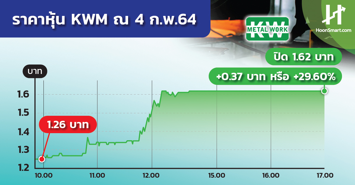 ราคาหุ้นบริษัท ดับบลิว.เม็ททัล เวิร์ค (KWM) ปรับตัวขึ้นแรง โดยมีแรงซื้อเก็งกำไรเข้ามาดันราคาหุ้นปรับตัวขึ้นแรงในการซื้อขายตั้งแต่ช่วงเช้า ท่ามกลางมูลค่าซื้อขายที่ดูหนาตาขึ้น ราคาหุ้นวิ่งขึ้นไปซิลลิ่งสนิทที่ 1.62 บาท เพิ่มขึ้น 0.37 หรือ 29.60% ท่ามกลางมูลค่าซื้อขายที่มากกว่าปกติ 44.60 ล้านบาท
