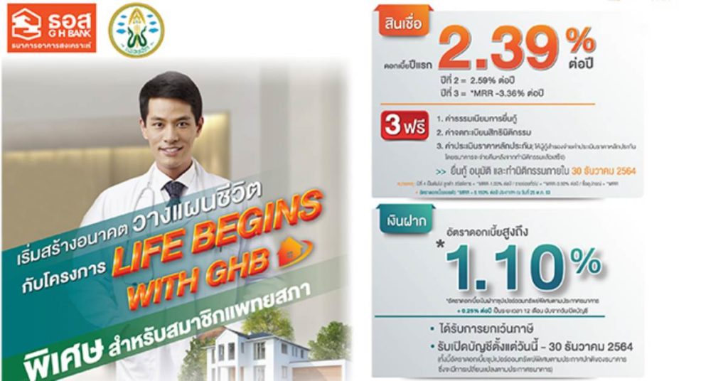 ทั้งนี้ แพทย์ที่มีความประสงค์จะใช้ผลิตภัณฑ์อัตราดอกเบี้ยพิเศษของ ธอส. ทั้งทางด้านสินเชื่อและเงินฝาก ภายใต้ “โครงการ Life Begins with GHB” ต้องเป็นสมาชิกแพทยสภา โดยสามารถยื่นกู้ ทำนิติกรรม และเปิดบัญชีเงินฝาก ได้แล้วตั้งแต่บัดนี้ถึงวันที่ 30 ธันวาคม 2564