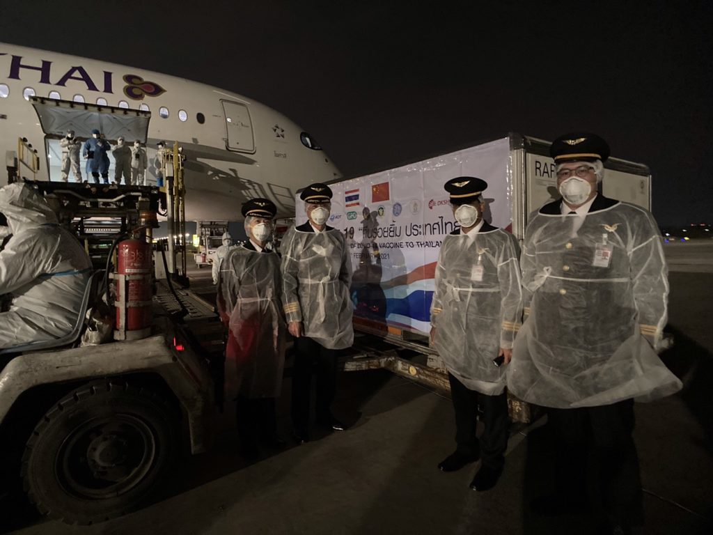 วัคซีนโควิด-19 ล็อตแรก ขนส่งมายังประเทศไทยด้วยเที่ยวบินขนส่งสินค้า (Cargo) เที่ยวบินที่ ทีจี 675 เส้นทางปักกิ่ง-กรุงเทพฯ ทำการบินด้วยเครื่องบินแบบแอร์บัส A350-900 ออกเดินทางจากสาธารณรัฐประชาชนจีน ในวันที่ 24 กุมภาพันธ์ 2564 เวลา 05.50 น. (เวลาท้องถิ่น) ถึงกรุงเทพฯ เวลา 10.05 น. ที่ท่าอากาศยานสุวรรณภูมิ และบริษัทฯมีความพร้อมในการขนส่งวัคซีนล็อตต่อๆไป เพื่อคนไทย เพื่อช่วยบรรเทาสถานการณ์การแพร่ระบาดของโรคโควิด-19 อันจะมีส่วนร่วมสนับสนุนการขับเคลื่อนภาคเศรษฐกิจ อุตสาหกรรม และภาคสังคมโดยรวม