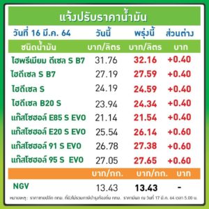 บริษัท ปตท. (PTT) และบางจาก คอร์ปอเรชั่น (BCP) ประกาศปรับขึ้นราคาขายปลีกน้ำมันดีเซลทุกชนิด 0.40 บาทและน้ำมันเบนซิน รวมถึงแก๊สโซฮอล์ทุกชนิด ลิตรละ 0.60 บาท ยกเว้น E85  ขึ้นลิตรละ 0.40 บาท มีผลตั้งแต่เวลา 05.00 น. วันพรุ่งนี้ (17 มี.ค.64)
