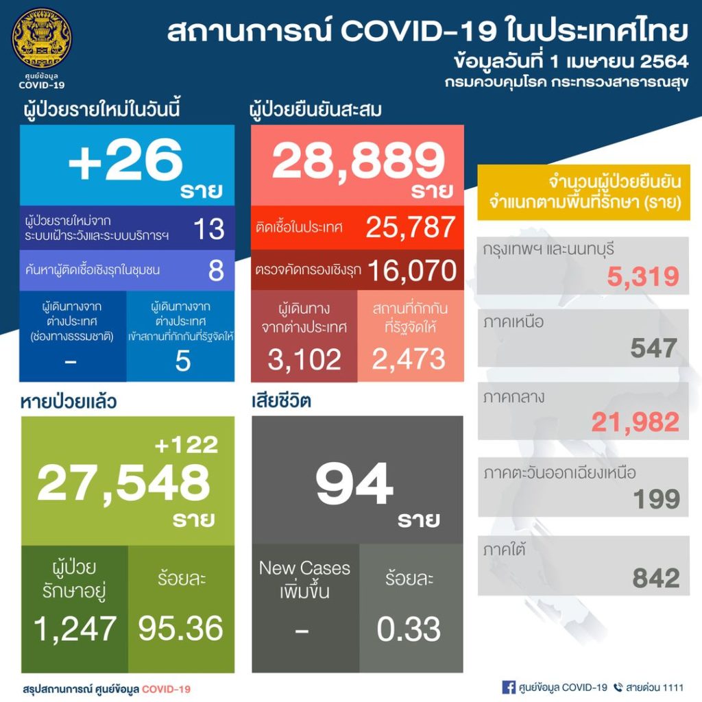 ศูนย์บริหารสถานการณ์การแพร่ระบาดของโรคติดเชื้อไวรัสโคโรนา 2019 (COVID-19) หรือ ศบค. แถลงสถานการณ์ประจำวันที่ 1 เม.ย. 2564 พบผู้ติดเชื้อโควิด-19 รายใหม่เพิ่มขึ้น 26 ราย ยอดสะสม 28,889 ราย โดยเป็นผู้ป่วยรายใหม่จากระบบเฝ้าระวังและระบบบริการ 13 ราย ค้นหาผู้ติดเชื้อเชิงรุกในชุมชน 8 ราย เดินทางมาจากต่างประเทศ 5 ราย