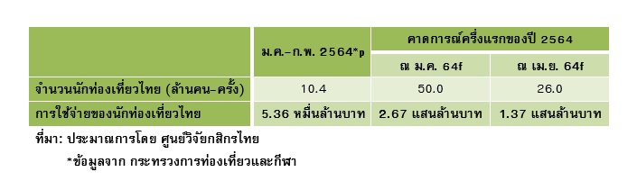 นอกจากนี้ ภายใต้ความเสี่ยงที่การควบคุมการระบาดระลอก 3 ที่น่าจะใช้ระยะเวลานานกว่ารอบก่อนหน้า เนื่องจากพบผู้ติดเชื้อสูงและการแพร่เชื้อที่เร็ว ซึ่งกระทบต่อแผนการเดินทางท่องเที่ยวของคนไทยในช่วงไตรมาส 2 ทำให้ ศูนย์วิจัยกสิกรไทย มองว่า การระบาดของโควิดทั้ง 2 ครั้งที่เกิดขึ้น น่าจะส่งผลกระทบทำให้ในช่วงครึ่งแรกของปี 2564 นี้ รายได้ตลาดไทยเที่ยวไทยมีมูลค่าประมาณ 1.37 แสนล้านบาท คิดเป็นรายได้ท่องเที่ยวที่หายไปเป็นมูลค่ากว่า 1.30 แสนล้านบาท เทียบกับคาดการณ์เดิม ณ ม.ค.64