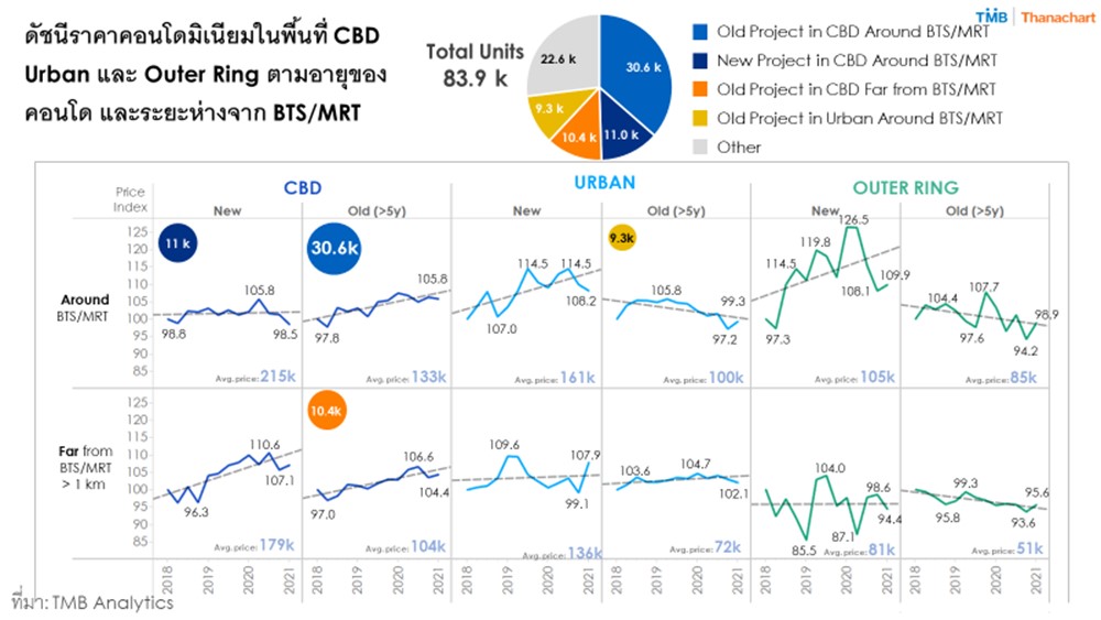 TMB Analytics ประเมินภาพรวมราคาคอนโดมิเนียมในช่วงสถานการณ์โควิดในปี 2564 โดยในพื้นที่เขตย่านใจกลางธุรกิจ (CBD) ราคาปรับลดลง 2% ขณะที่พื้นที่รอบนอกราคาลดลงแรง 4-6% แต่เริ่มมีสัญญาณฟื้นตัวในไตรมาสแรกปีนี้ อย่างไรก็ตามการระบาดของโรคโควิด-19 ระลอกใหม่ยังคงเป็นปัจจัยที่จะส่งผลกระทบต่อการฟื้นตัวของราคาคอนโดมิเนียม นอกจากนี้ คอนโดมิเนียมระดับ Hi-End ยังคงมีราคาอยู่ในระดับสูงต่อเนื่อง และไม่ได้รับผลกระทบจากการระบาดของโรคโควิด-19