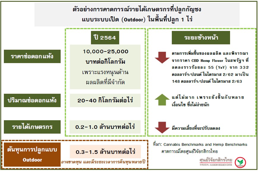 ศูนย์วิจัยกสิกรไทย ประเมินว่า ในปี 2564 รายได้จากช่อดอกกัญชงจากการปลูกแบบระบบเปิด (Outdoor) ที่ให้ผลผลิตช่อดอกกัญชงแห้งราว 20-40 กิโลกรัมต่อไร่ อาจจะอยู่ที่ราว 0.2-1.0 ล้านบาทต่อไร่ เนื่องจากราคารับซื้อที่สูงเพราะผลผลิตที่ยังมีจำกัดเป็นหลัก ขณะที่ต้นทุนการปลูกที่คาดว่าจะต้องใช้เงินลงทุนเบื้องต้น 0.3-1.5 ล้านบาทต่อไร่ ทำให้เป็นไปได้ว่า ผู้ลงทุนปลูกกัญชงอาจต้องใช้ระยะเวลาคืนทุนประมาณ 4-5 ปี สำหรับการปลูกเพื่อเส้นใยกัญชงนั้น แม้ราคารับซื้อจะถูกกว่าช่อดอก แต่ผลผลิตที่ได้จะมากกว่า ทำให้รายได้ ต้นทุน และระยะเวลาคืนทุน อาจจะไม่แตกต่างกันมากนัก