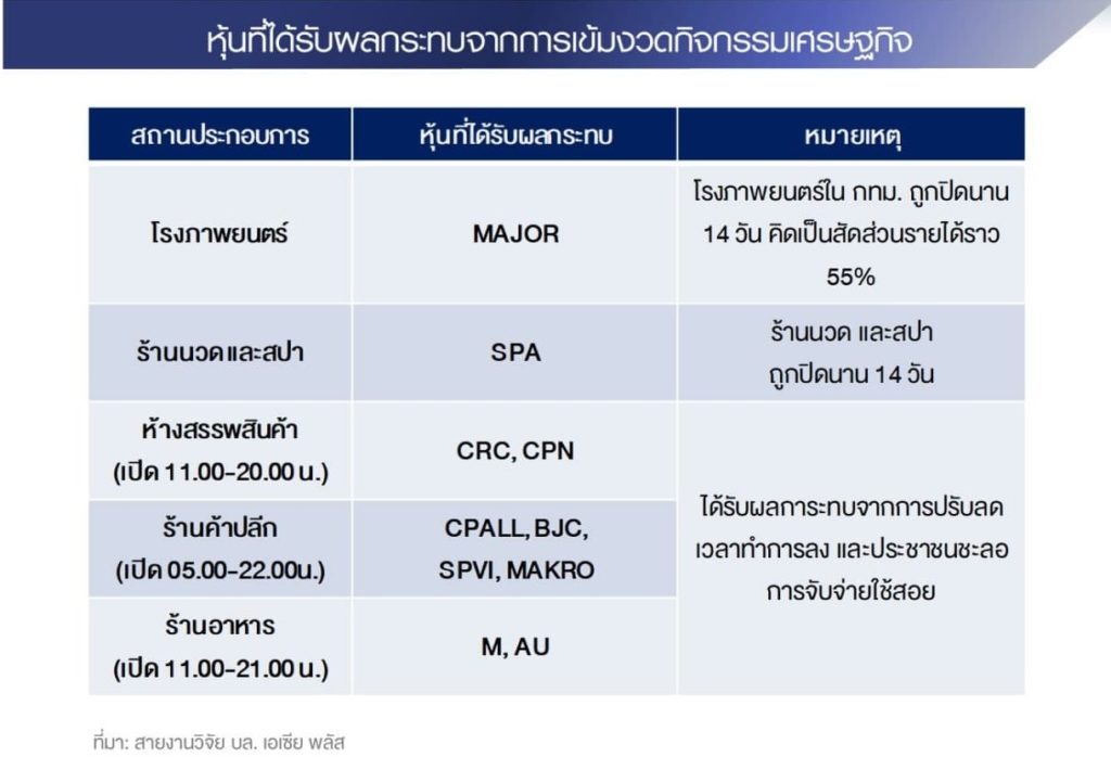 HoonSmart.com>> บล.เอเซีย พลัส มองมาตรการคุม Covid-19 กดดัน SET Index ช่วงสั้น มองลบหุ้น 5 กลุ่มหลังรัฐออกมาตรการคุมเข้มการแพร่ระบาด “โรงหนัง-ร้านอาหาร-ค้าปลีก-นวดสป-ห้าง” หวังวัคซีนเร่งฉีด มาตรการรัฐฯ หนุนครึ่งปีหลังฟื้นตัว ชี้จังหวะราคาหุ้นอ่อนตัว โอกาสสะสมหุ้นพื้นฐานแกร่ง CPALL-MAKRO-CRC-SPVI