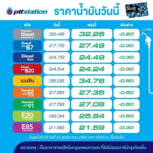 ส่งผลให้ราคาน้ำมันขายปลีกในพื้นที่กรุงเทพฯ ที่ยังไม่รวมภาษีบำรุงท้ององถิ่น วันพรุ่งนี้ เป็นดังนี้ น้ำมันเบนซิน ออกเทน 95 ของ PTT Station อยู่ที่ลิตรละ 34.76 บาท, แก๊สโซฮอล์ 95 ลิตรละ 27.35 บาท, แก๊สโซฮอล์ 91 ลิตรละ 27.08 บาท, E20 ลิตรละ 25.84 บาท และ E85 ลิตรละ 21.59 บาท ส่วนดีเซล B7 อยู่ที่ลิตรละ 27.49 บาท, B10 ลิตรละ 24.49 บาท และ B20 ลิตรละ 24.24 บาท
