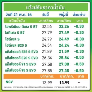 บริษัท OR และ บางจาก คอร์ปอเรชั่น (BCP) ประกาศปรับลดราคาขายปลีกน้ำมันทุกชนิด โดยกลุ่มเบนซิน แก๊ซโซฮอล์ และน้ำมันดีเซลลด 0.50 บาท/ลิตร ส่วน E85 ลด 0.30 บาท/ลิตร มีผลตั้งแต่ 5 นาฬิกา วันพรุ่งนี้ ( 22 พ.ค.)