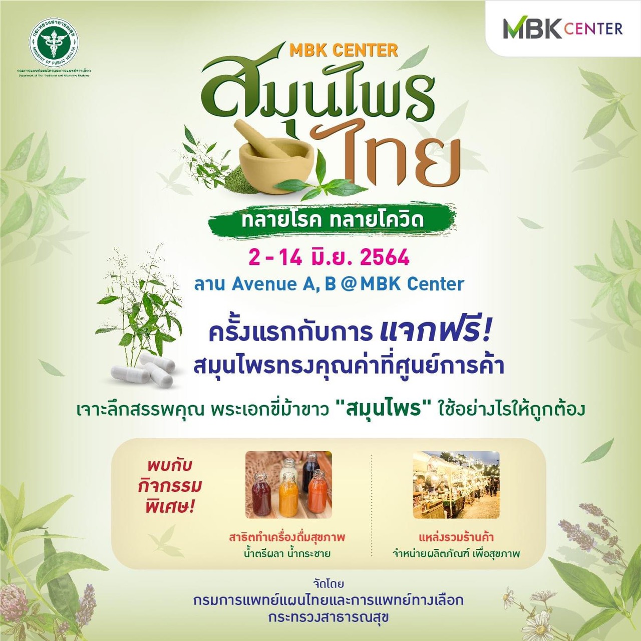 ศูนย์การค้าเอ็ม บี เค เซ็นเตอร์ ร่วมกับ กรมการแพทย์แผนไทยและการแพทย์ทางเลือก กระทรวงสาธารณสุข  จัดงาน งานดี ๆ เกี่ยวกับการดูแลสุขภาพ สำหรับงาน สมุนไพรไทย ทลายโรค ทลายโควิด ตั้งแต่วันนี้ – 14 มิถุนายน 2564 ณ ลานกิจกรรมเอ็ม บี เค อเวนิว โซน A ,B  สร้างความรู้ความเข้าใจให้กับประชาชนในการนำตำรับยาจากสมุนไพรภูมิปัญญาแพทย์แผนไทยที่ช่วยเสริมสร้างภูมิคุ้มกันโรคมาดูแลสุขภาพของตนเอง