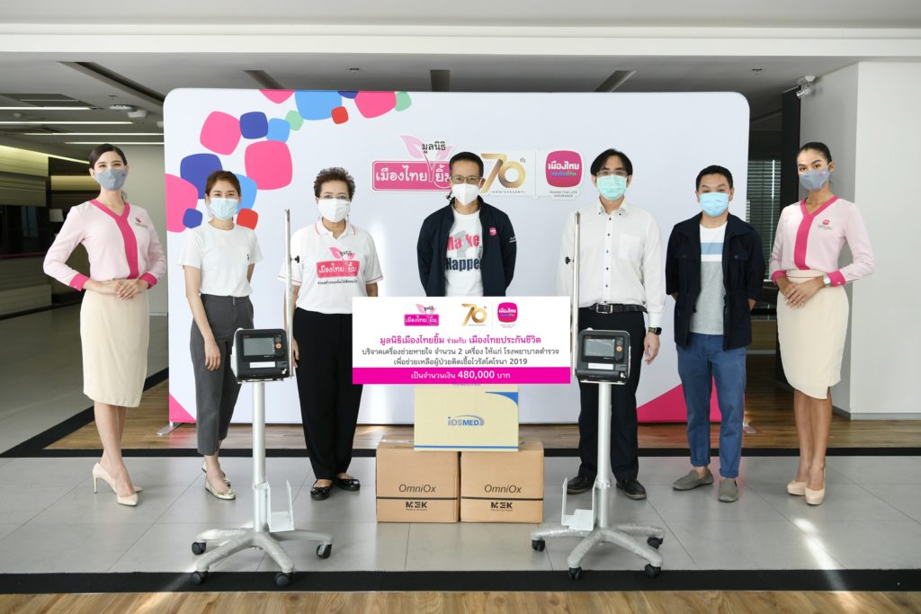 สาระ ล่ำซำ กรรมการผู้จัดการและประธานเจ้าหน้าที่บริหาร เมืองไทยประกันชีวิต, นายแพทย์วุฒิวงศ์ สมบุญเรืองศรี ผู้ช่วยกรรมการผู้จัดการอาวุโส, รัชดา พุ่มสุวรรณ ผู้ช่วยกรรมการผู้จัดการอาวุโส และดวงกมล ลิขสิทธิพันธุ์ ผู้ช่วยกรรมการผู้จัดการ ร่วมกับมูลนิธิเมืองไทยยิ้ม โดยพิตราภรณ์ บุณยรัตพันธุ์ รองประธานกรรมการมูลนิธิเมืองไทยยิ้ม บริจาคเครื่องช่วยหายใจจำนวน 2 เครื่อง เป็นจำนวนเงิน 480,000 บาท ให้แก่โรงพยาบาลตำรวจ เพื่อนำไปช่วยเหลือผู้ป่วยติดเชื้อไวรัสโคโรนา 2019 (COVID–19) ณ เมืองไทยประกันชีวิต สำนักงานใหญ่