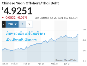 นักเศรษฐศาสตร์หลายรายคาด “จีนยังไม่ขึ้นดอกเบี้ยปีนี้” ส่วนหนึ่งเพราะ PBOC “เข้มงวด” นำหน้าใครๆไว้เยอะตั้งแต่ช่วงครึ่งหลังปี 2020 แถมตัวเลขเศรษฐกิจจีนล่าสุดส่งสัญญาณ “ชะลอ” (ยังเติบโตแต่ช้าลง) โดยเฉพาะการบริโภค เปิดทางให้ PBOC ฉีดสภาพคล่องเพิ่มขึ้นดังที่กล่าวไปแล้ว อย่างไรก็ตาม ความต้องการหยวนจากภาคธุรกิจ (corporate demand) เพิ่มขึ้นครั้งแรกของปีในเดือน พ.ค. ช่วยพยุงให้เงินอ่อนค่าไม่มากนัก แม้ผู้กำหนดนโยบายเริ่มหันมาผ่อนคลาย