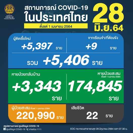 ศูนย์บริหารสถานการณ์โควิด-19 (ศบค.) รายงานสถานการณ์การแพร่ระบาดของโรคติดเชื้อไวรัสโคโรนา 2019 (COVID-19) ณ วันที่ 28 มิ.ย.2564 พบผู้ติดเชื้อใหม่รวม 5,406 ราย แบ่งเป็นผู้ติดเชื้อใหม่ 5,397 ราย ติดเชื้อภายในเรือนจำ/ที่ต้องขัง 9 ราย โดยมีผู้เสียชีวิต 22 ราย รักษาหายกลับบ้านจำนวน 3,343 ราย