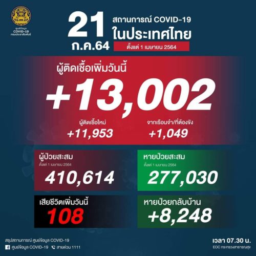 ศูนย์บริหารสถานการณ์โควิด-19 (ศบค.) รายงานสถานการณ์การแพร่ระบาดของโรคติดเชื้อไวรัสโคโรนา 2019 (COVID-19) ณ วันที่ 21 ก.ค.2564 พบผู้ติดเชื้อใหม่รวม 13,002 ราย แบ่งเป็นติดเชื้อใหม่ 11,953 ราย ติดเชื้อภายในเรือนจำ/ที่ต้องขัง 1,049 ราย ผู้ป่วยสะสม 410,614 ราย (ตั้งแต่ 1 เมษายน) หายป่วยกลับบ้าน 8,248 ราย ยอดหายป่วยสะสม 277,030 ราย (ตั้งแต่ 1 เมษายน) และมีผู้เสียชีวิตเพิ่ม 108 ราย