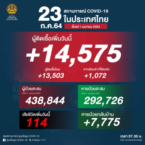 ศูนย์บริหารสถานการณ์โควิด-19 (ศบค.) รายงานสถานการณ์การแพร่ระบาดของโรคติดเชื้อไวรัสโคโรนา 2019 (COVID-19) ณ วันที่ 23 ก.ค.2564 พบผู้ติดเชื้อใหม่รวม 14,575 ราย แบ่งเป็นติดเชื้อใหม่ 13,503 ราย ติดเชื้อภายในเรือนจำ/ที่ต้องขัง 1,072 ราย ผู้ป่วยสะสม 438,844 ราย (ตั้งแต่ 1 เมษายน) หายป่วยกลับบ้าน 7,775 ราย ยอดหายป่วยสะสม 292,726 ราย (ตั้งแต่ 1 เมษายน) และมีผู้เสียชีวิตเพิ่ม 114 ราย