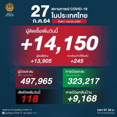 ศูนย์บริหารสถานการณ์โควิด-19 (ศบค.) รายงานสถานการณ์การแพร่ระบาดของโรคติดเชื้อไวรัสโคโรนา 2019 (COVID-19) ณ วันที่ 27 ก.ค.2564 พบผู้ติดเชื้อใหม่รวม 14,150ราย แบ่งเป็นติดเชื้อใหม่ 13,905 ราย ติดเชื้อภายในเรือนจำ/ที่ต้องขัง 245 ราย ผู้ป่วยสะสม 497,965 ราย (ตั้งแต่ 1 เมษายน) หายป่วยกลับบ้าน 9,168 ราย ยอดหายป่วยสะสม 323,217 ราย (ตั้งแต่ 1 เมษายน) และมีผู้เสียชีวิตเพิ่ม 118 ราย