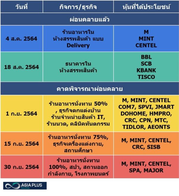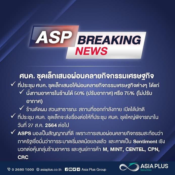 ด้านบล.เอเซีย พลัส มองเป็นสัญญาณที่ดี เพราะการเสนอผ่อนคลายกิจกรรมสะท้อนว่าภาครัฐเชื่อว่าการระบาดเริ่มลดน้อยแล้วและคาดเป็น Sentiment เชิงบวกต่อหุ้นกลุ่มร้านอาหารและศูนย์การค้า M, MINT, CENTEL, CPN, CRC