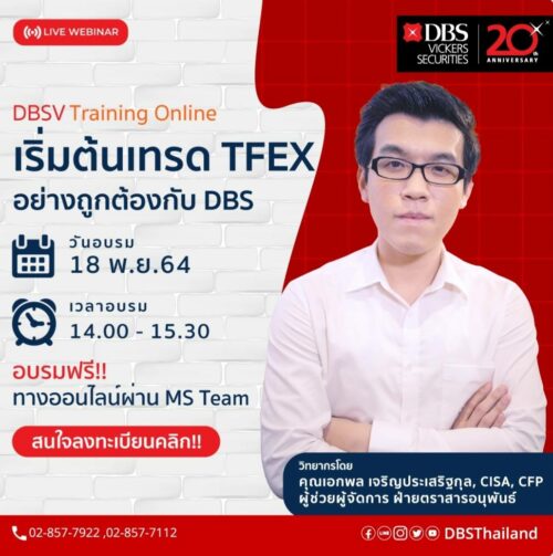 บริษัทหลักทรัพย์ดีบีเอส วิคเคอร์ส (ประเทศไทย) จัดสัมมนาอบรมออนไลน์ส่งท้ายปี หัวข้อ “เริ่มต้นเทรด TFEX อย่างถูกต้องกับ DBS” วันที่ 18 พ.ย. 64 เวลา 14.00 – 15.30 น. ผ่านช่องทาง MS Team ฟรี ไม่มีค่าใช้จ่าย สนใจลงทะเบียนคลิก https://bit.ly/3GrRbs9