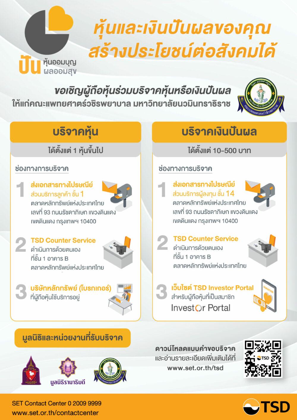 ตลาดหลักทรัพย์ฯ โดย บริษัท ศูนย์รับฝากหลักทรัพย์ (ประเทศไทย) จำกัด (TSD) เดินหน้าขยายโครงการ “ปันหุ้นออมบุญ ปันผลออมสุข” เพิ่มการเปิดรับบริจาคหุ้นและเงินปันผลจากผู้ถือหุ้นมอบให้คณะแพทยศาสตร์วชิรพยาบาล มหาวิทยาลัยนวมินทราธิราช เพื่อนำไปช่วยเหลือผู้ป่วยยากไร้ในโครงการต่าง ๆ ของโรงพยาบาลวชิรพยาบาล คณะแพทยศาสตร์วชิรพยาบาล มหาวิทยาลัยนวมินทราธิราช ซึ่งจะเป็นประโยชน์ต่อสังคมในวงกว้างต่อไป