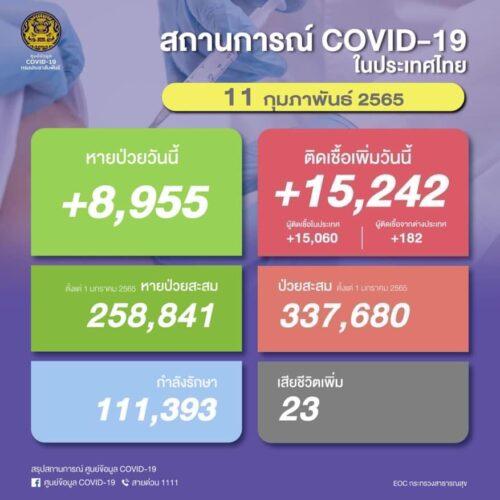 ศูนย์บริหารสถานการณ์โควิด-19 (ศบค.) รายงานสถานการณ์การแพร่ระบาดของโรคติดเชื้อไวรัสโคโรนา 2019 (COVID-19) ณ วันที่ 11 กุมภาพันธ์ 2565 พบผู้ติดเชื้อใหม่รวม 15,242 ราย แบ่งเป็นผู้ป่วยในประเทศ 15,060 ราย ผู้ป่วยมาจากต่างประเทศ 182 ราย ผู้ป่วยสะสม 337,6808 ราย (ตั้งแต่ 1 มกราคม 2565)