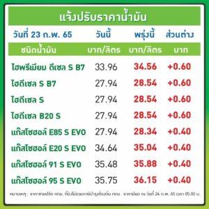 HoonSmart.com>>ปตท.น้ำมันและการค้าปลีก (OR) และ บางจาก คอร์ปอเรชั่น (BCP) ปรับขึ้นราคาขายปลีกน้ำมันกลุ่มเบนซินและแก๊สโซฮอล์ทุกชนิดลิตรละ 40 สต. ส่วนน้ำมันกลุ่มดีเซลทุกชนิดขึ้นลิตรละ 60 สต. มีผลตั้งแต่เวลา 05.00 น.วันที่ 24 ก.พ. 65