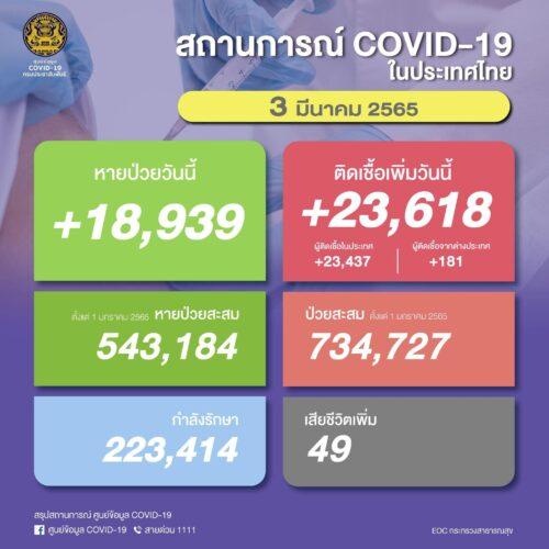 ศูนย์บริหารสถานการณ์โควิด-19 (ศบค.) รายงานสถานการณ์การแพร่ระบาดของโรคติดเชื้อไวรัสโคโรนา 2019 (COVID-19) ณ วันที่ 3 มีนาคม 2565 พบผู้ติดเชื้อใหม่รวม 23,618 ราย แบ่งเป็นผู้ป่วยในประเทศ 23,437 ราย ผู้ป่วยมาจากต่างประเทศ 181 ราย ผู้ป่วยสะสม 734,727 ราย (ตั้งแต่ 1 มกราคม 2565)