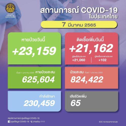 ศูนย์บริหารสถานการณ์โควิด-19 (ศบค.) รายงานสถานการณ์การแพร่ระบาดของโรคติดเชื้อไวรัสโคโรนา 2019 (COVID-19) ณ วันที่ 7 มีนาคม 2565 พบผู้ติดเชื้อใหม่รวม ยอดผู้ติดเชื้อเพิ่ม 21,162 ราย แบ่งเป็นผู้ป่วยในประเทศ 21,060 ราย ผู้ป่วยมาจากต่างประเทศ 102 ราย ผู้ป่วยสะสม 824,422 ราย (ตั้งแต่ 1 มกราคม 2565)