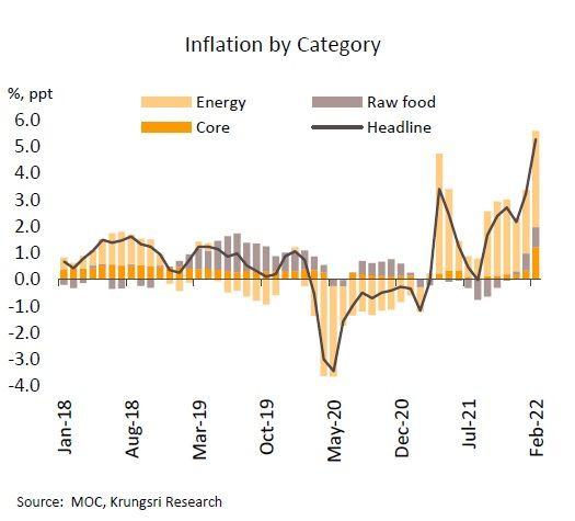 วิจัยกรุงศรีรายงานว่า อัตราเงินเฟ้อเดือนก.พ. พุ่งสู่ระดับสูงสุดในรอบกว่า 13 ปี และยังมีแนวโน้มเพิ่มขึ้นจากวิกฤตราคาพลังงานที่ได้รับผลกระทบจากสงครามยูเครน โดยอัตราเงินเฟ้อทั่วไปเดือนก.พ. อยู่ที่ 5.28% YoY เร่งขึ้นจาก 3.23% ในเดือนม.ค. สาเหตุจากการปรับขึ้นของราคาสินค้าในกลุ่มพลังงานเป็นสำคัญ อาทิ ค่ากระแสไฟฟ้า และน้ำมันเชื้อเพลิงขายปลีกในประเทศตามราคาน้ำมันดิบในตลาดโลกที่เพิ่มสูงขึ้นอย่างต่อเนื่อง