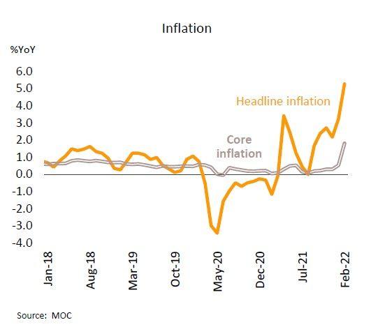อย่างไรก็ตาม ทางการได้มีมาตรการปรับลดภาษีสรรพสามิตน้ำมันดีเซล ซึ่งจะช่วยตรึงราคาไม่ให้เกิน 30 บาทต่อลิตร จนถึงเกือบสิ้นเดือนพฤษภาคม นอกจากนี้ สินค้าในกลุ่มอาหารโดยเฉพาะอาหารสำเร็จรูป และอาหารบริโภคนอกบ้าน มีการปรับราคาสูงขึ้นตามต้นทุนวัตถุดิบ ด้านอัตราเงินเฟ้อพื้นฐาน (หักราคาหมวดอาหารสดและพลังงาน) เร่งขึ้นมาอยู่ที่ 1.80% สูงสุดในรอบกว่า 7 ปี จาก 0.52% เดือนมกราคม สำหรับในช่วง 2 เดือนแรกของปีนี้ อัตราเงินเฟ้อทั่วไปและอัตราเงินเฟ้อพื้นฐาน เฉลี่ยอยู่ที่ 4.25% และ 1.16% ตามลำดับ