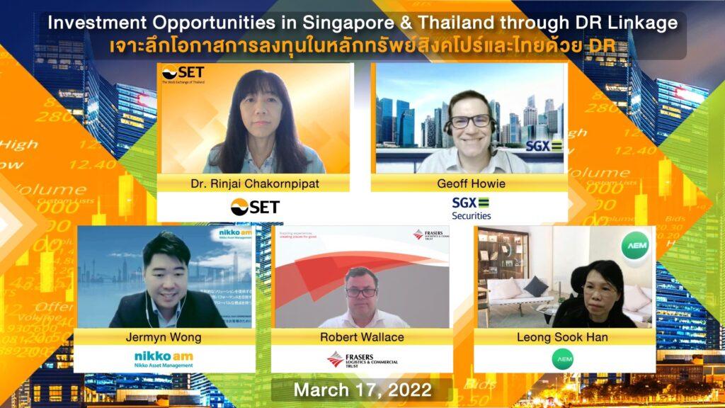 ตลาดหลักทรัพย์แห่งประเทศไทย ร่วมกับ ตลาดหลักทรัพย์สิงคโปร์ (SGX) จัดสัมมนา “Investment opportunities in Singapore & Thailand through DR Linkage เจาะลึกโอกาสการลงทุนในหลักทรัพย์สิงคโปร์และไทย ด้วย DR” เพื่อให้ข้อมูลแก่ผู้ลงทุนสถาบัน ผู้ลงทุนบุคคล และผู้สนใจ เกี่ยวกับการซื้อขายตราสารแสดงสิทธิการฝากหลักทรัพย์ต่างประเทศ (DR) ระหว่างประเทศไทยและสิงคโปร์ที่จะมีขึ้นในอนาคต พร้อมทิศทางการลงทุน และการนำเสนอข้อมูลหลักทรัพย์ที่น่าสนใจจากบริษัทจดทะเบียนของสิงคโปร์ โดยมี รินใจ ชาครพิพัฒน์ รองผู้จัดการ หัวหน้าสายงานการตลาด ตลาดหลักทรัพย์แห่งประเทศไทย กล่าวต้อนรับ