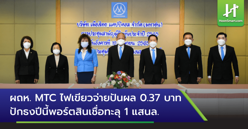 พลเรือเอกอภิชาติ เพ็งศรีทอง ประธานกรรมการ และคุณชูชาติ เพ็ชรอำไพ ประธานกรรมการบริหาร บริษัท เมืองไทย แคปปิตอล จำกัด (มหาชน) หรือ MTC พร้อมคณะผู้บริหาร ถ่ายภาพร่วมกันหลังการประชุมสามัญผู้ถือหุ้นประจำปี 2565 โดยผู้ถือหุ้นมีมติอนุมัติจ่ายเงินปันผล 0.37 บาท/หุ้น ขึ้นเครื่องหมาย XD ในวันที่ 28 เม.ย. และมีกำหนดจ่าย 17 พ.ค.นี้ ปักธงปี 65 พอร์ตสินเชื่อทะลุ 1 แสนล้านบาท บุกปล่อยกู้รากหญ้าครบวงจร พร้อมเร่งทำการตลาด ปล่อยกู้ซื้อรถจักรยานยนต์ใหม่-เครื่องใช้ไฟฟ้า ตามคอนเซ็ปต์ “ซื้อก่อน ผ่อนทีหลัง” มั่นใจดันผลงานโตแกร่ง งานดังกล่าวจัดขึ้นเมื่อเร็วๆ นี้