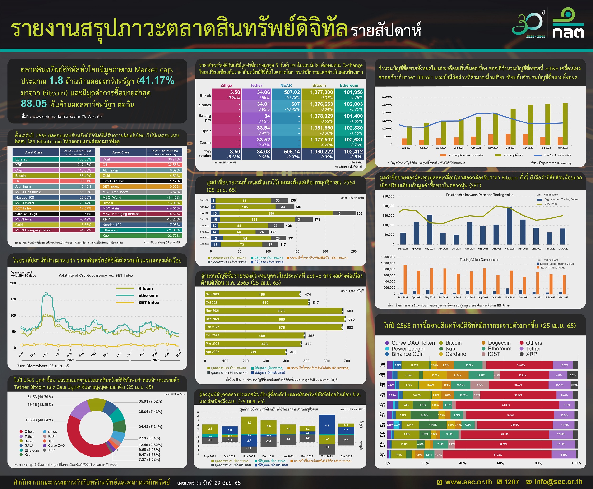 HoonSmart.com>> สำนักงาน ก.ล.ต. รายงานสรุปข้อมูลสำคัญเกี่ยวกับตลาดสินทรัพย์ดิจิทัล เช่น มูลค่าการซื้อขายสินทรัพย์ดิจิทัลในไทย ราคาสินทรัพย์ดิจิทัลในแต่ละ Exchange ของไทยเทียบกับตลาดโลก เพื่อเป็นข้อมูลให้ได้ติดตามเป็นประจำทุกสัปดาห์