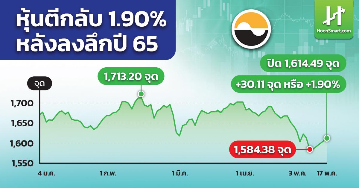วันที่ 17 พ.ค.2565 ตลาดหุ้นไทยวิ่งแรงตามต่างประเทศ ดัชนีปิดที่ 1,614.49 จุด เพิ่มขึ้น 30.11 จุดหรือ +1.90%มู ลค่าซื้อขายรวม 85,186.24 ล้านบาท จากแรงซื้อของต่างชาติ 3,204.89 ล้านบาท และสถาบันไทยซื้อ 2,668.99 ล้านบาท ส่วนนักลงทุนไทยขาย 5,078.94 ล้านบาท ด้านค่าเงินบาทแข็งปิดที่ 34.53 บาท จับตาถ้อยแถลงประธานเฟด